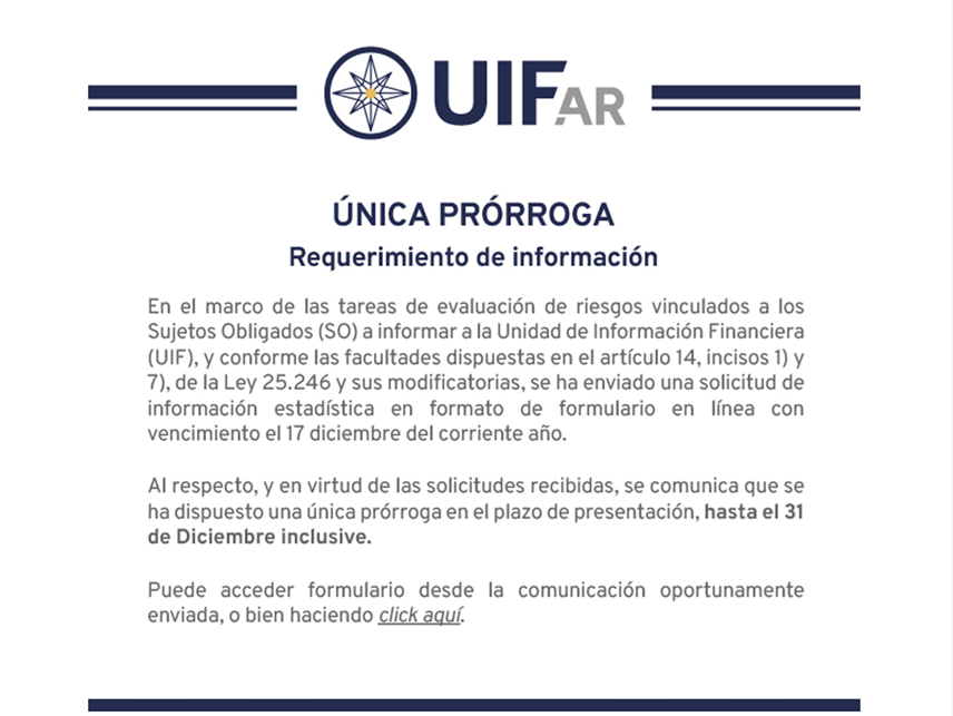 La Unidad de Información Financiera (UIF) cambió la fecha límite de presentación de los Reportes Sistemáticos Anuales (RSA) del 2025, uno de los requerimientos obligatorios que deben presentar las mutuales que son sujetos obligados. La nueva fecha límite de presentación de estos documentos es hasta el 31 de diciembre de 2025 inclusive.